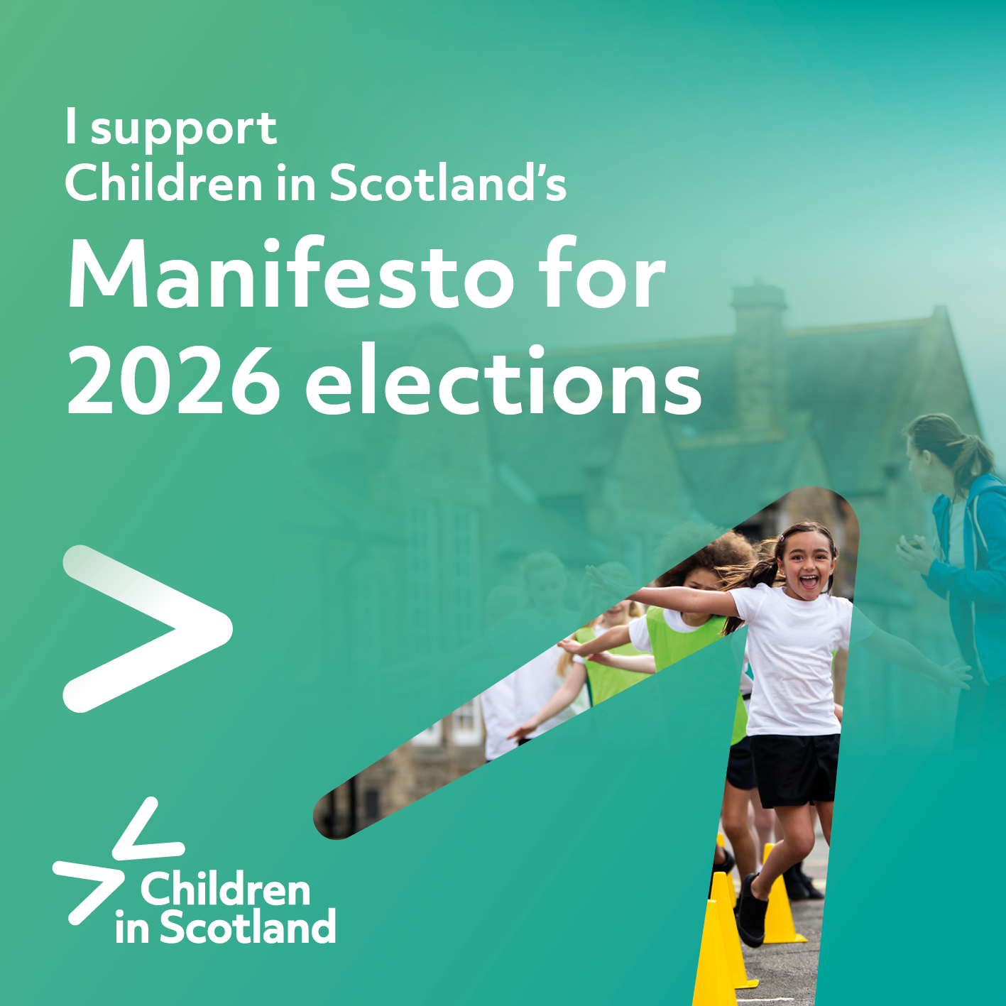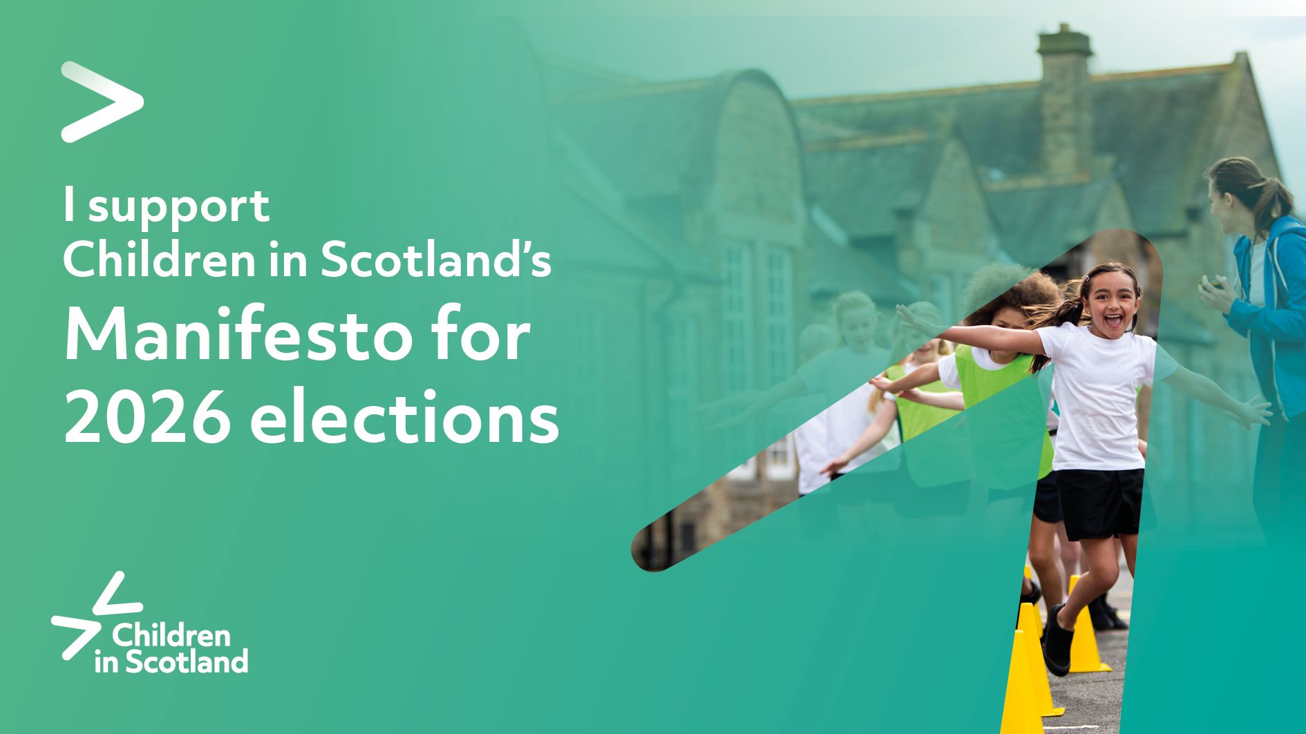 General – landscapeAlt text: Alt text: Graphic reading ‘I support Children in Scotland’s Manifesto for 2026 elections,’ with the Children in Scotland logo and a photo of children playing in a school playground overlaid with green-teal gradient design.Download -