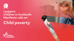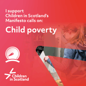 Child poverty – landscapeAlt text: Graphic reading ‘I support Children in Scotland’s Manifesto calls on: Child Poverty,’ with the Children in Scotland logo and a photo of a child working with papers and overlaid with red gradient design.Download -