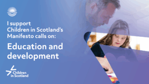Education and development – squareAlt text: Graphic reading ‘I support Children in Scotland’s Manifesto calls on: Education and development,’ with the Children in Scotland logo and a photo of an adult supporting a child with learning activities, overlaid with a blue-purple gradient design.Download