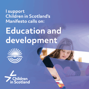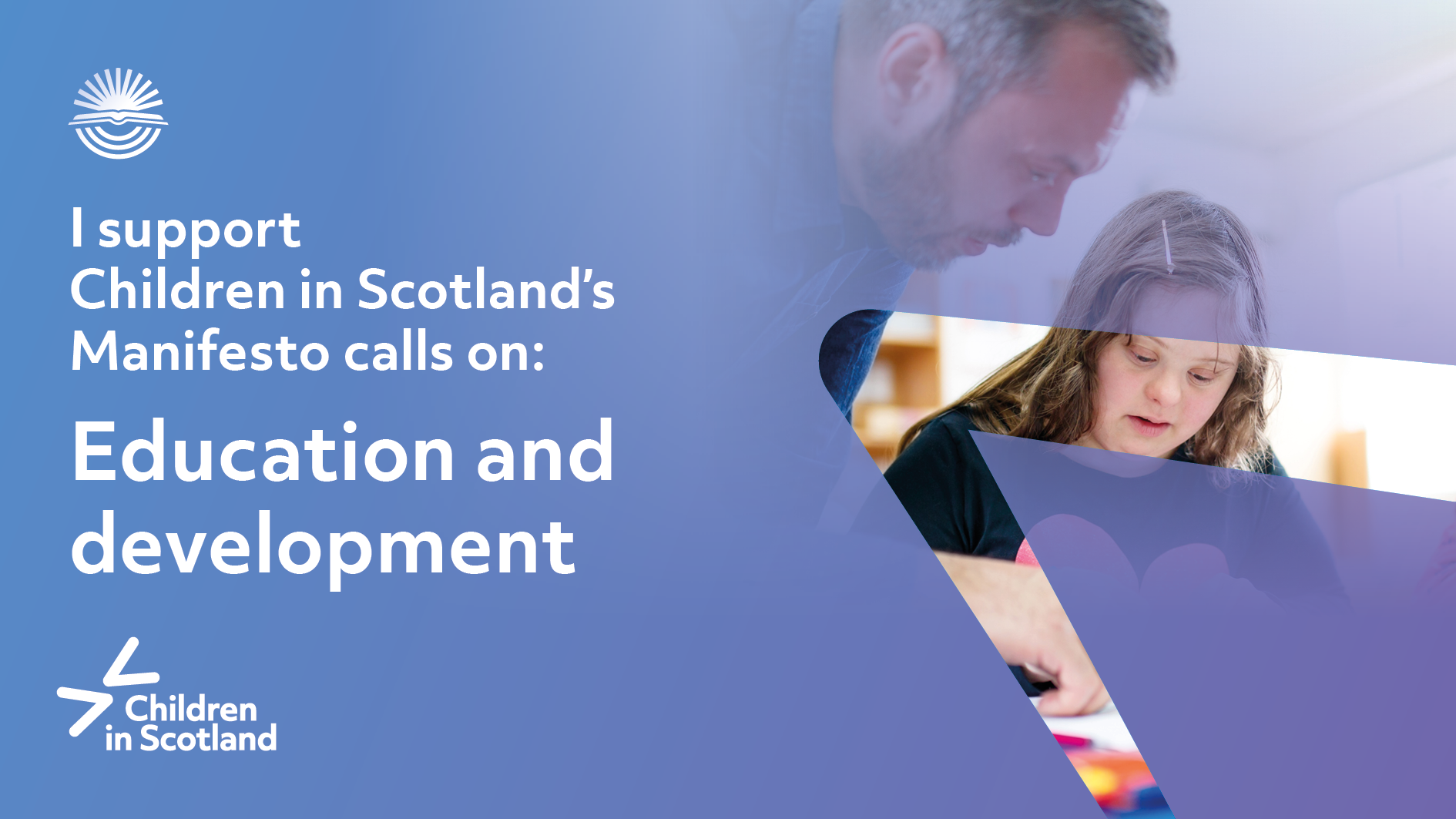 Education and development – landscapeAlt text: Graphic reading ‘I support Children in Scotland’s Manifesto calls on: Education and development,’ with the Children in Scotland logo and a photo of an adult supporting a child with learning activities, overlaid with a blue-purple gradient design.Download -