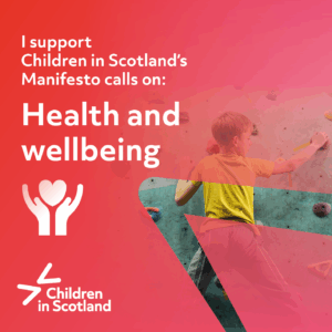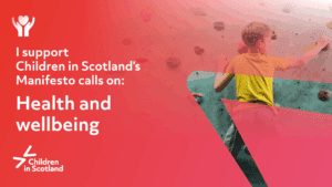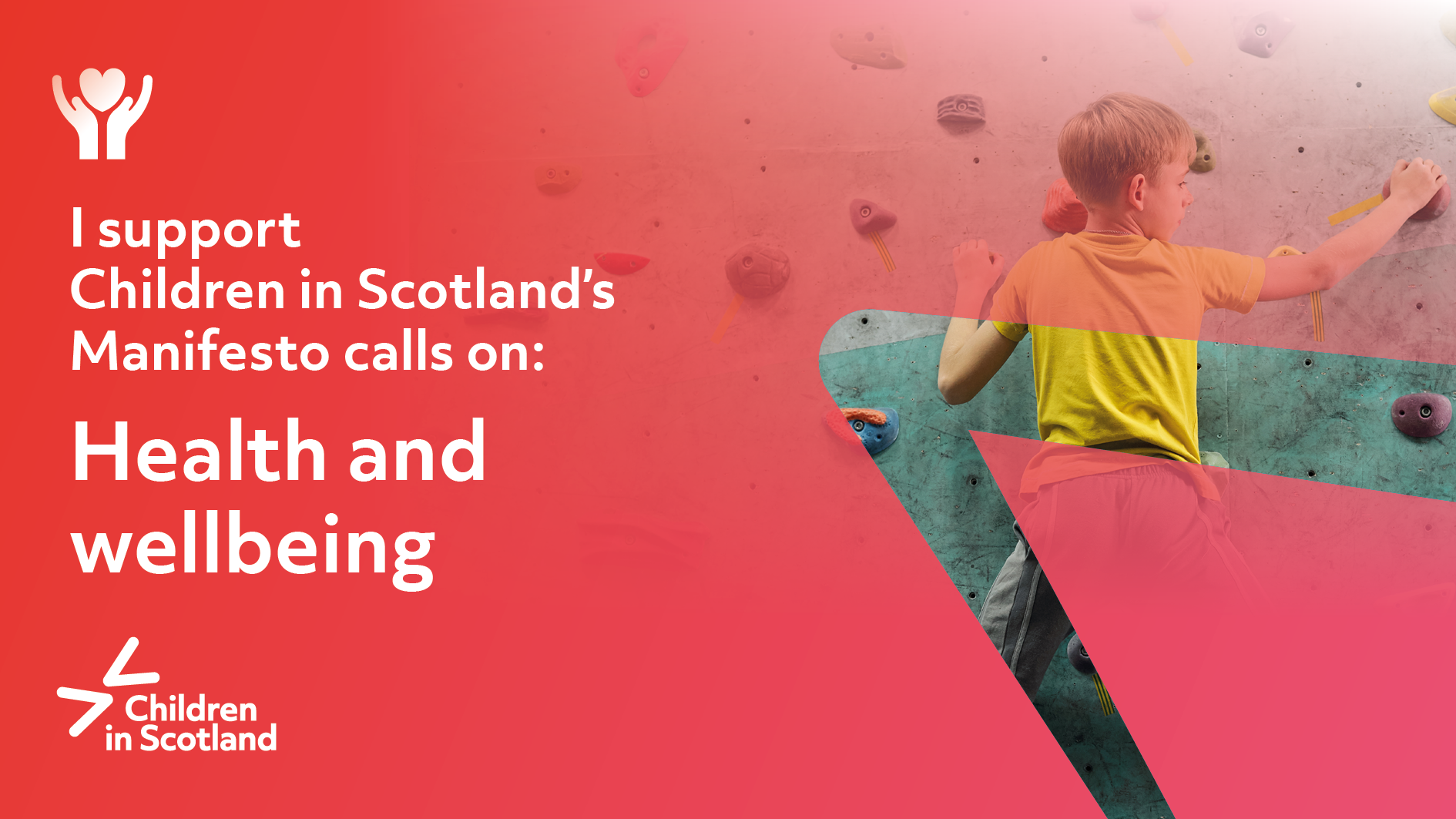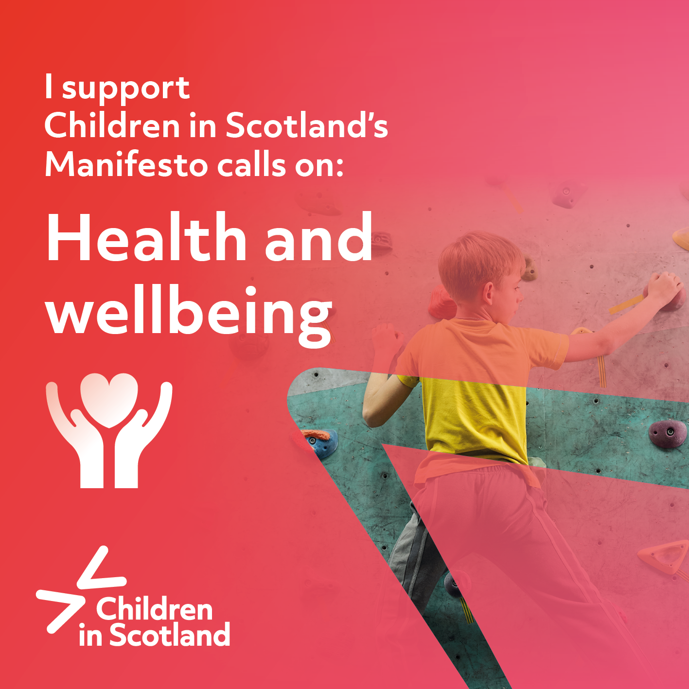 Health and wellbeing – landscapeAlt text: Graphic reading ‘I support Children in Scotland’s Manifesto calls on: Health and wellbeing,’ with the Children in Scotland logo and a photo of a child climbing on a climbing wall, overlaid with red gradient design.Download -