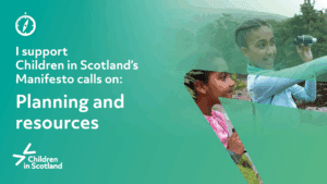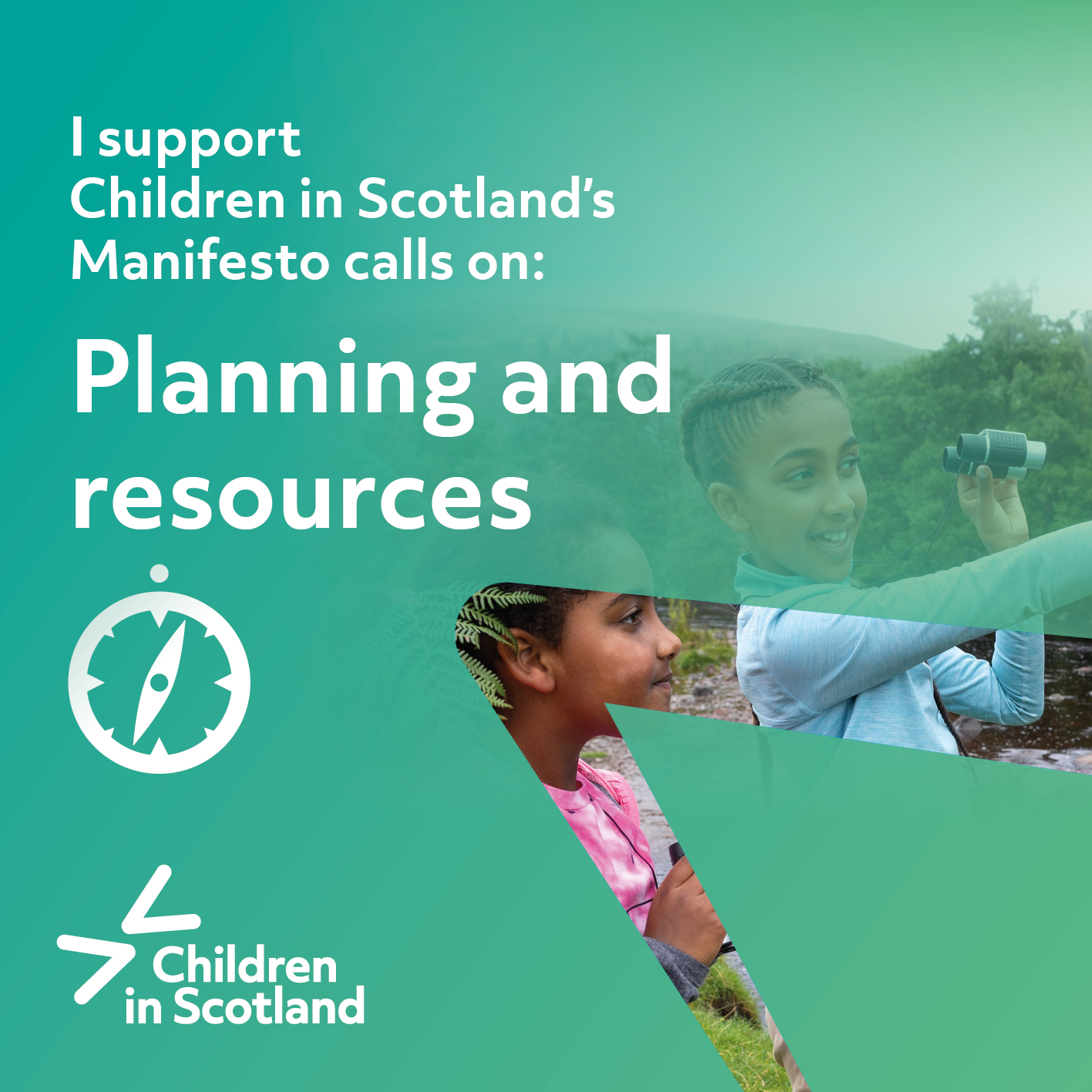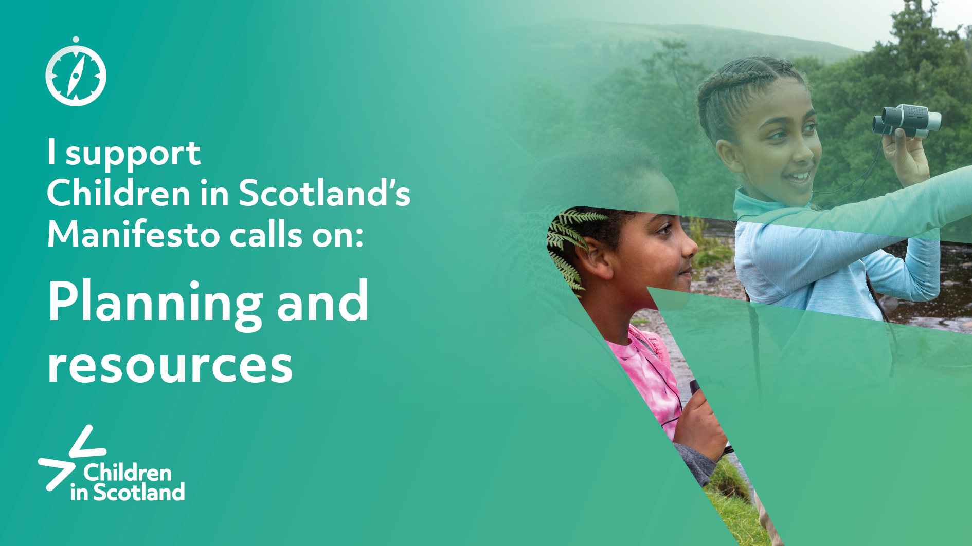 Planning and resources – landscapeAlt text: Graphic reading ‘I support Children in Scotland’s Manifesto calls on: Planning and resources,’ with the Children in Scotland logo and a photo of two children in nature using a pair of binoculars, overlaid with teal-green gradient design.Download -
