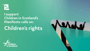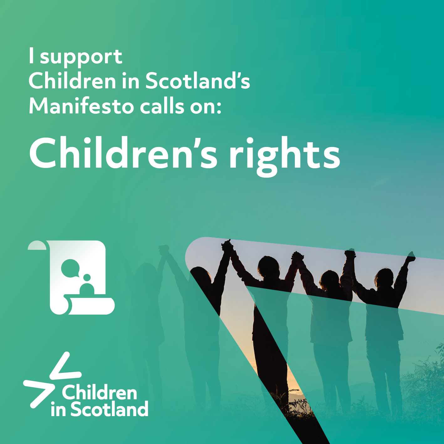 Children’s rights – landscapeAlt text: Graphic reading ‘I support Children in Scotland’s Manifesto calls on: Children’s rights,’ with the Children in Scotland logo and a silhouetted group of children holding hands with raised arms against a sky, overlaid with a green-blue gradient design.Download -